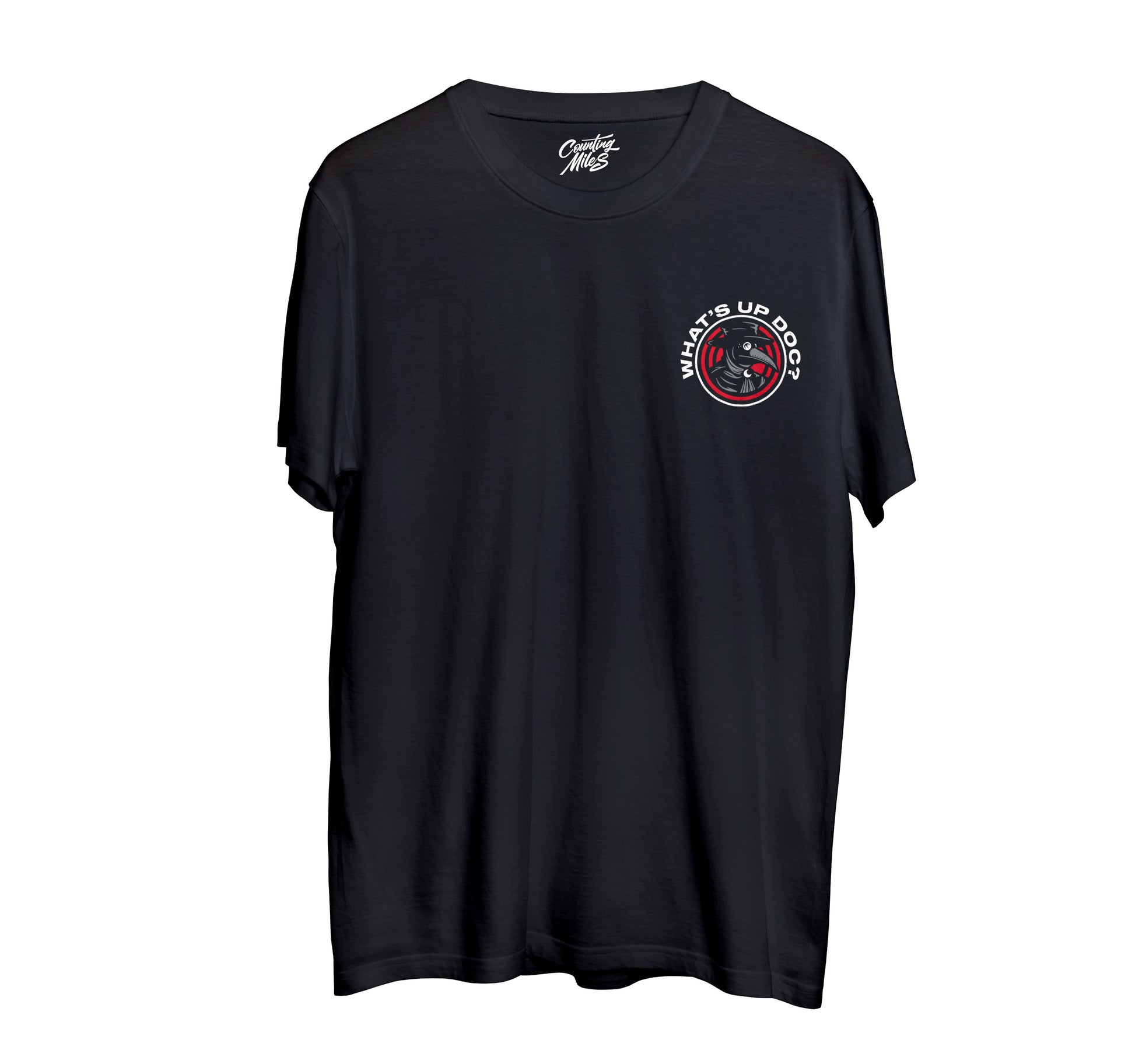 Counting Miles What's Up Doc? design on peck. On one of our super soft and durable Counting Miles short-sleeve tees.